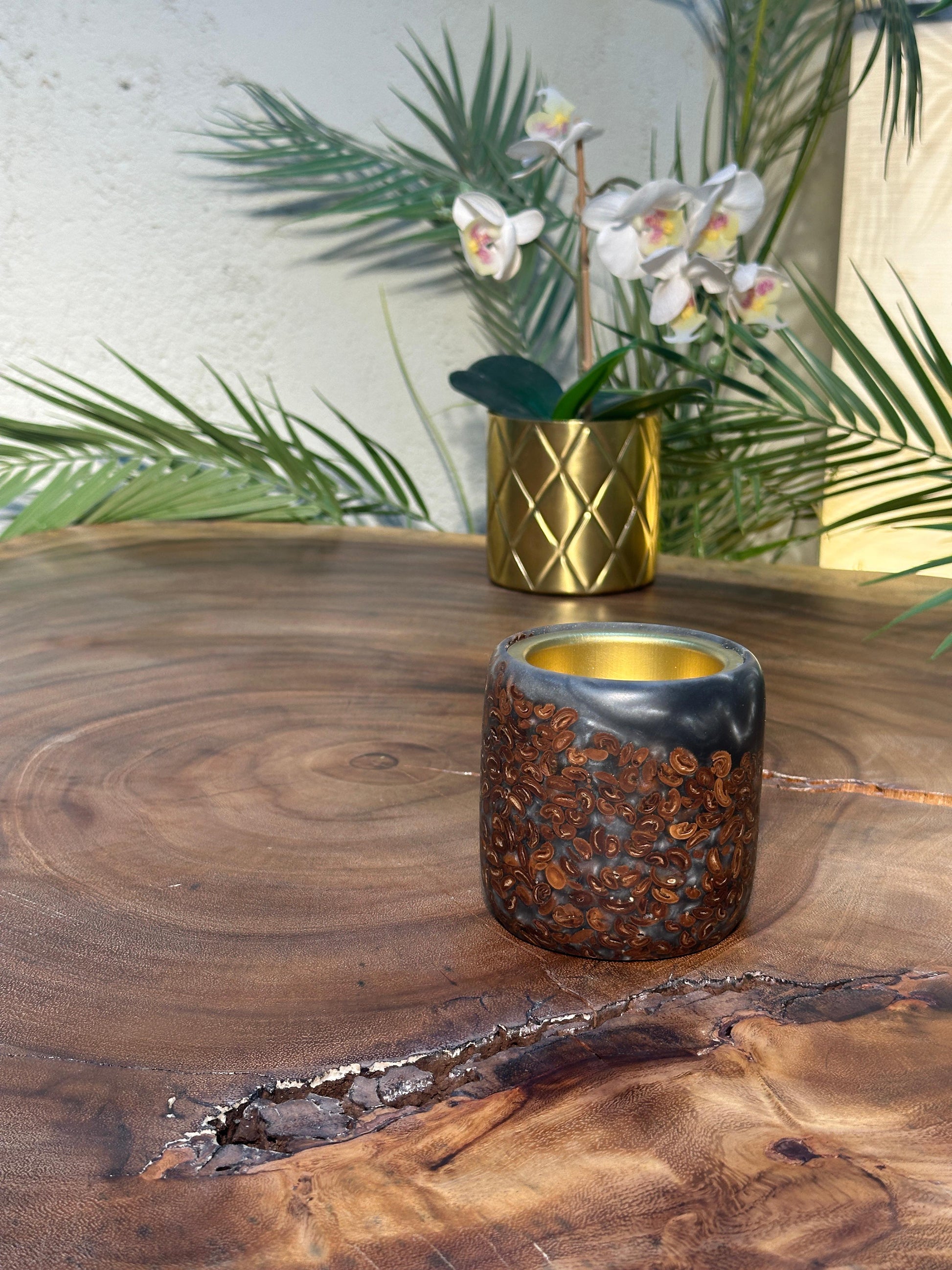مبخر من حبوب القهوة الطبيعية ومادة الرزن صنعت عن طريق الخراطة وكل قطعة تكون مميزه ومختلفة ولاتتكرر